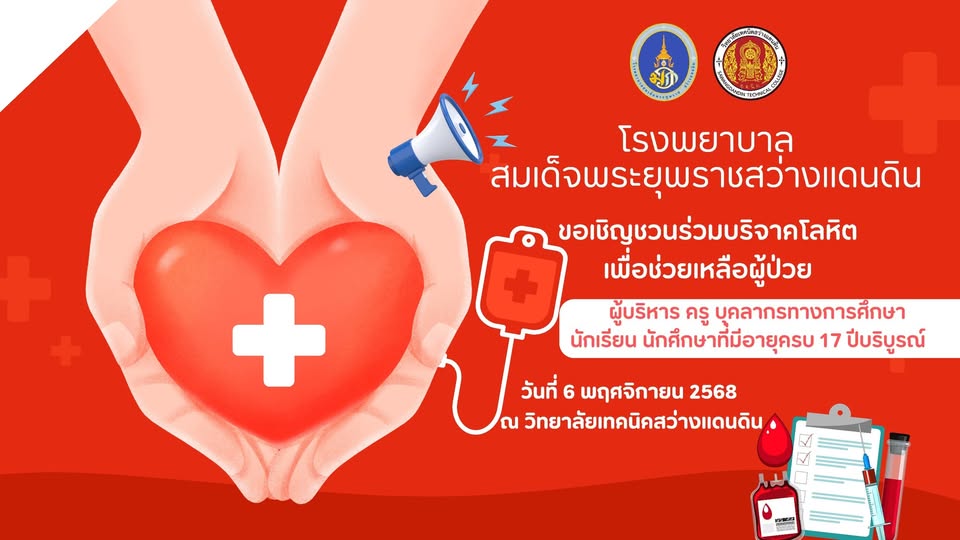 โรงพยาบาลสมเด็จพระยุพราชสว่างแดนดิน ขอเชิญร่วมบริจาคโลหิตเพื่อช่วยเหลือผู้ป่วย ในวันที่ 6 พฤศจิกายน 2568 เวลา 09.00 - 12.00 น. ณ วิทยาลัยเทคนิคสว่างแดนดิน