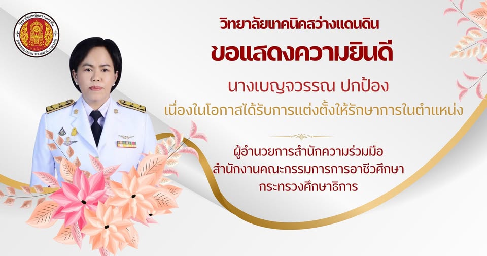 วิทยาลัยเทคนิคสว่างแดนดินขอแสดงความยินดี นางเบญจวรรณ ปกป้อง ผู้อำนวยการสำนักอำนวยการ