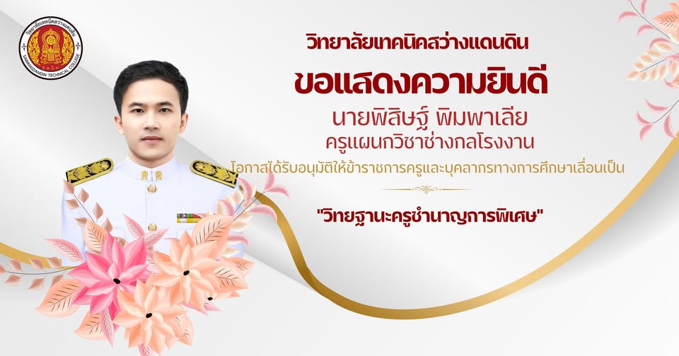 วิทยาลัยเทคนิคสว่างแดนดิน ขอแสดงความยินดีกับ นายพรทวี วงศ์เฉลิมศักดิ์ ครูเเผนกวิชาช่างยนต์ ในโอกาสได้รับอนุมัติให้ข้าราชการครูและบุคลากรทางการศึกษา เลื่อนเป็น "วิทยฐานะครูชำนาญการพิเศษ"
